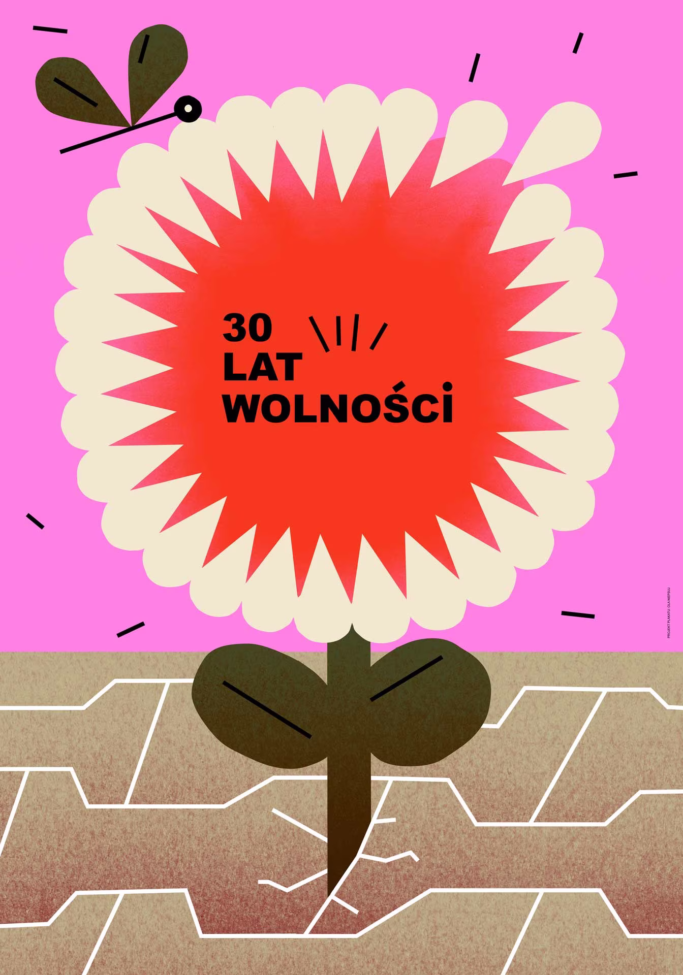 Poster interpreting the word “freedom” in celebration of the 30th anniversary of the first free elections in post-war Poland on June 4, 1989. The poster depicts a flower with 30 petals that grows, despite adversity, in the cracks of a concrete sidewalk. It symbolizes Poland’s path to the full freedom it enjoys today.