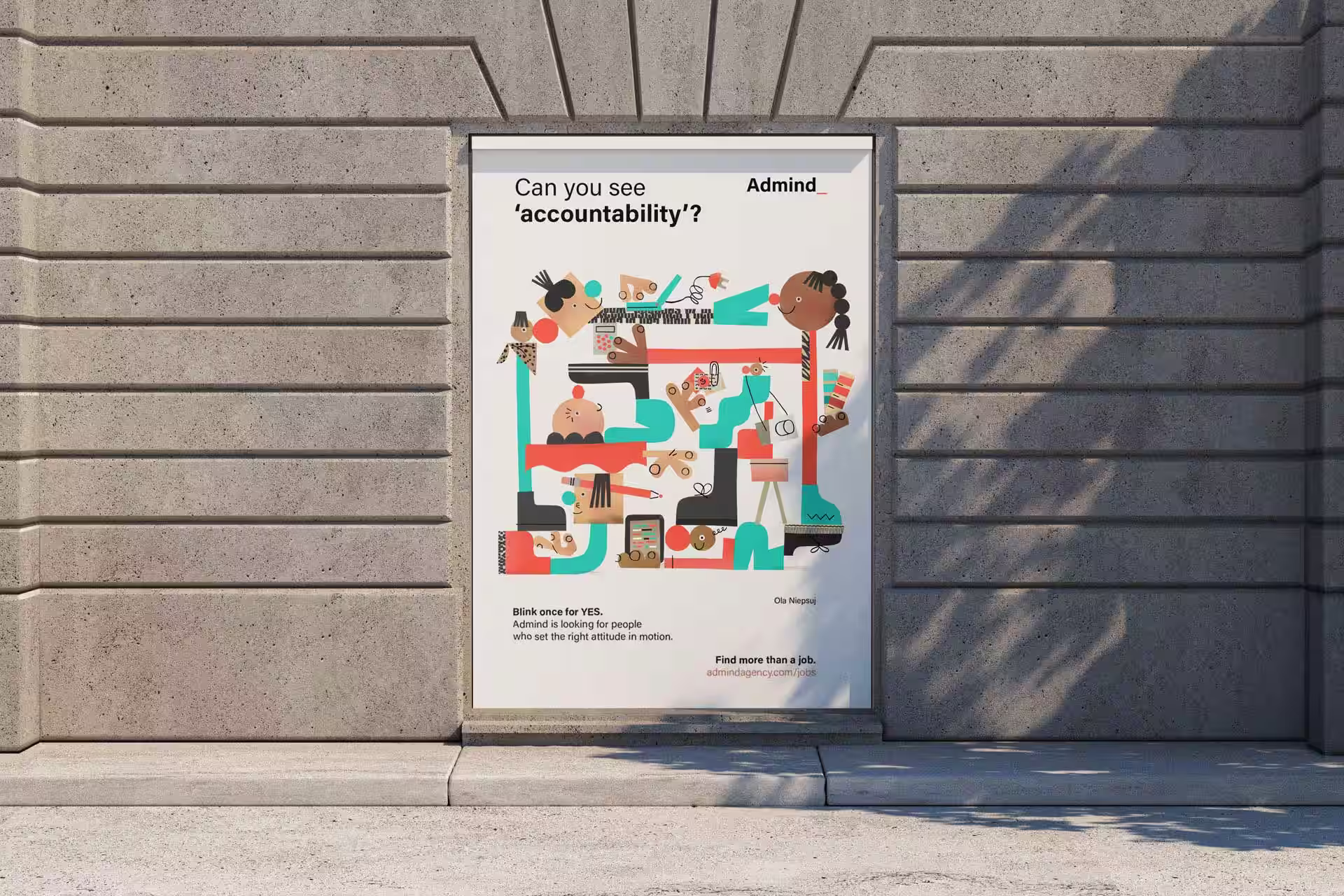 Illustration for Admind’s recruitment campaign. Ola Niepsuj, Kuba Banach and Paweł Mildner joined forces with Admind’s in-house designers to create a series of posters that highlighted the company’s core values: trust, cooperation, responsibility, adventure, satisfaction, and kindness. Each artist was given the freedom to express these values in a style that was uniquely their own. The recruitment campaign was a huge success, with 3000 people visiting the section, and Admind gaining hundreds of new followers on social media. It was recognized with numerous awards, including Red Dot Design Award in 2020 and the Creativity International Awards.