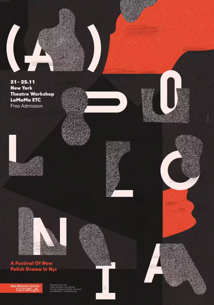 (A)pollonia is a Festival of New Polish Drama in NYC at Staged Readings by American Artists. The five-day festival, (A)pollonia: a Festival of Readings of New Polish Plays, took its name from the first compiled volume of publications, with nearly 600 pages of play scripts, extensive introductions and essays by its editors. The events included readings of seven plays by directors and prominent downtown companies – together with discussions and talkback sessions following the readings. The poster reflects the power of the written word and the unique atmosphere of theatre readings.