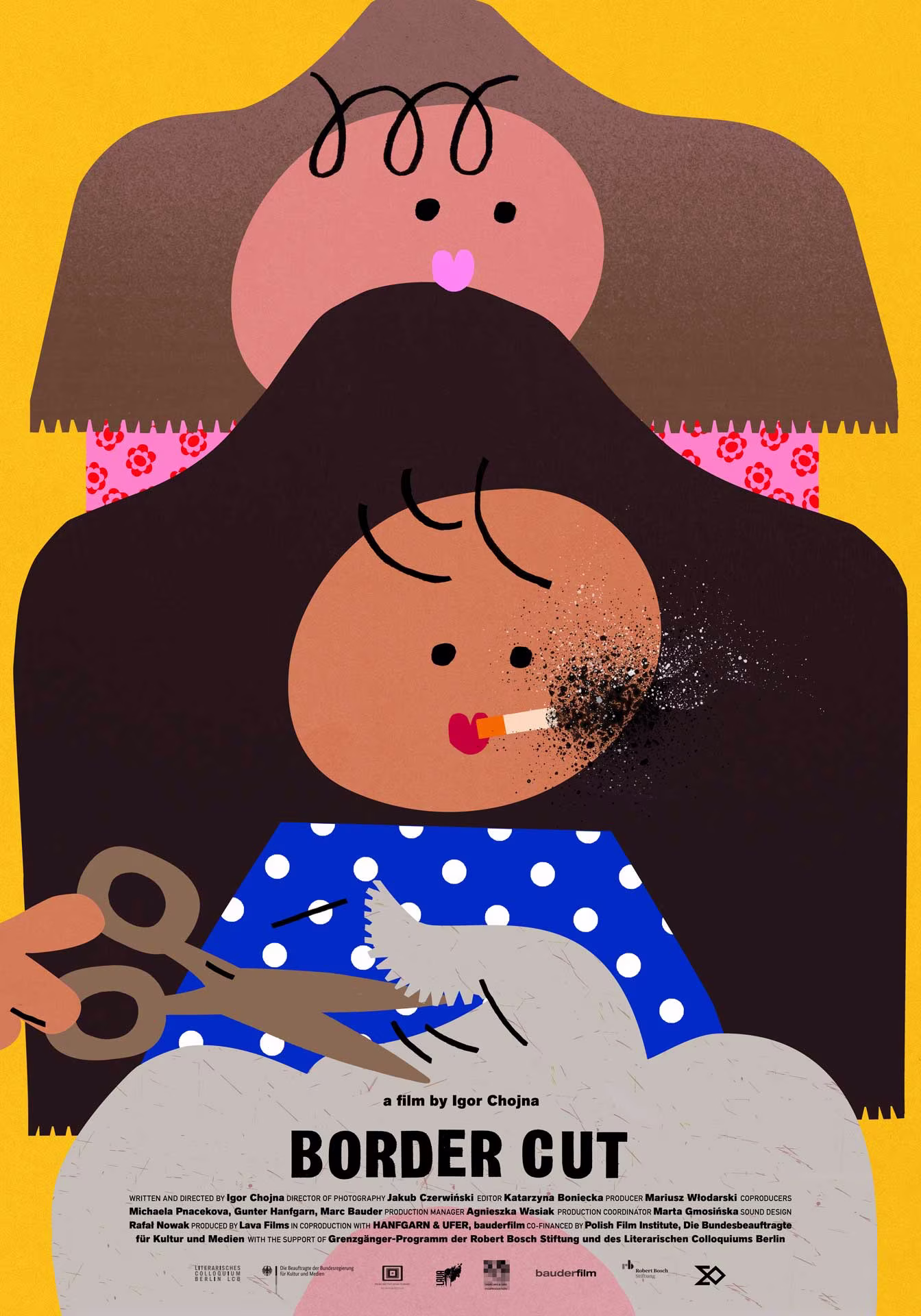 Film poster. Its layout refers to the tradition of Polish cut-outs and influenced by the vibrant colours of folk art, primarily from the Łowicz region. With a sense of playful ironic suspension, the form of the poster perfectly matches the plot of the film and its two symmetrical characters separated by a generational gap: an experienced hairdresser and her young carefree assistant to whom she tries to motherly pass on all the lessons of life. The clients of their salon are German seniors who cross the nearby border to a tiny Polish town, in search of cheaper hairdressing services.