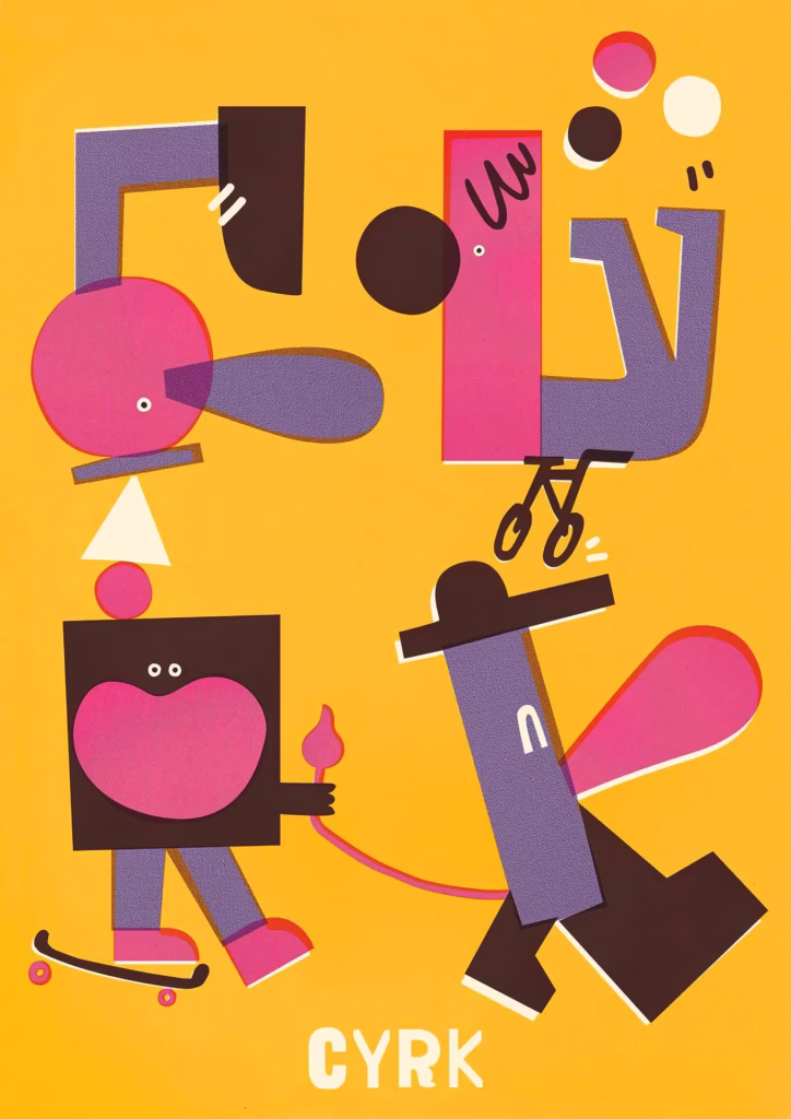 The poster is a typographic game with the word CYRK (Polish for circus). It derives from the tradition of the highly-acclaimed circus posters that were one of the most recognized subjects for the Polish School of Poster Art, popular for their mastery of dynamic composition, vibrant colours, handmade typography and humour, as well as their splashes of ambiguity. In this case, each clown stands for one of the letters – c,y,r and k, respectively. It was designed in a traditional way as an analogue collage.