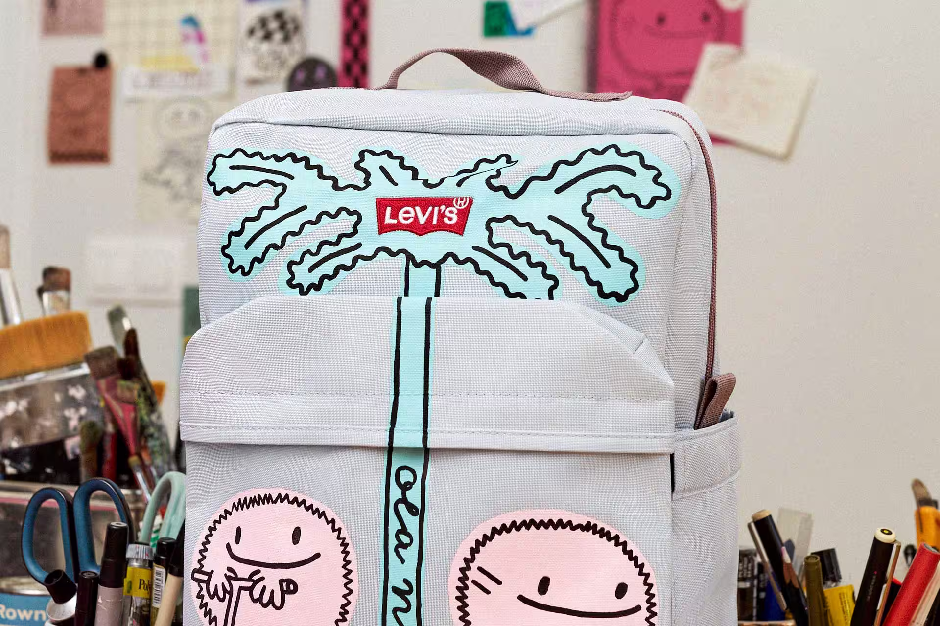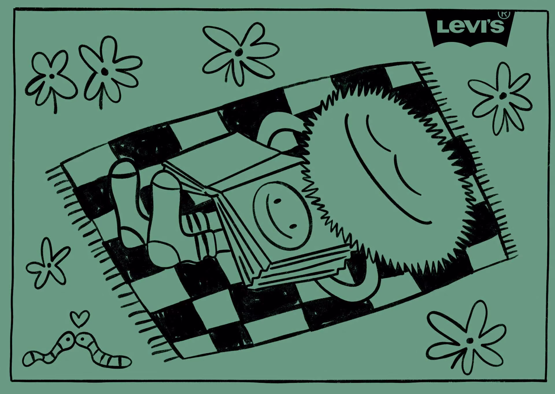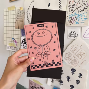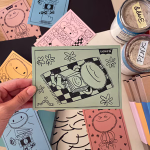 Set of 5 postcards with illustrations for the Levi’s Back To School ad campaign. The drawings reflect the five pillars of well-being: mental, physical, educational, spiritual and environmental. With bold messaging, vibrant colours and custom playful illustrations, the postcards become a mood-boosting gift for those who buy Levi’s products. The collaboration continued as a live Instagram painting of 5 backpacks with motifs from postcards.