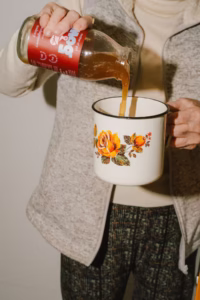 Drawing from the vibrant palette of the Mazovia region, each flavour is instantly identifiable: sunny yellow for classic chicken, deep burgundy for beef, soft pink for turkey, blue for fish and verdant green for the vegan option. The glass bottles feature wide necks for effortless pouring—even when the nutrient-dense broth has solidified—and a tamper-proof paper seal that allows for easy top-down identification in a refrigerator.