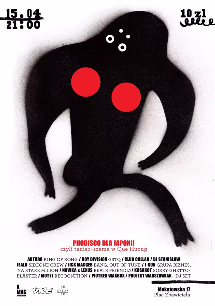 Poster advertising a charity event helping the victims of the Japanese earthquake and tsunami. A fresh take on Japanese symbols, which were not mechanically reproduced but rather interpreted anew for the sake of a metaphor. The base was a hand-made spray-painted collage.