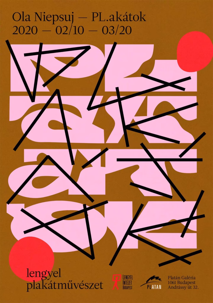 A poster design to promote my solo show. The exhibition PLakátok – Ola Niepsuj at Galéria Platán is a cross-sectional presentation of posters from across the last decade designed for films, concerts, exhibitions and festivals. The structural letter composition resembles an illustration, an architectural design, or an exhibition projection. The seemingly imperfect and haphazard form is a culmination of many years of inspiration from vernacular typography.