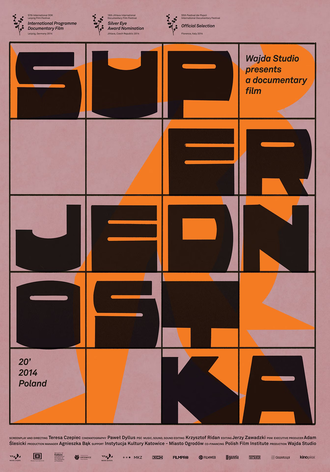 Super Unit (original title: Superjednostka) is a huge residential block designed in line with Le Corbusier’s idea of a “living machine.” The building’s 15 floors can house up to 3,000 people. Residents, in order to reach their apartments, have to overcome a real maze of corridors and stairs. The main characters of the documentary are people living inside the Super Unit and experiencing important moments of their lives there. The poster captures the architect’s idea – the residents become an interpenetrating unit, and the individual apartments are like blocks that form a legible whole. The typography was designed by hand on an architectural grid. The background illustration depicts a Mudulor – an anthropometric scale of proportions invented by Le Corbusier.