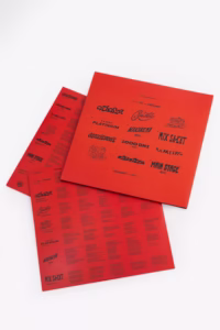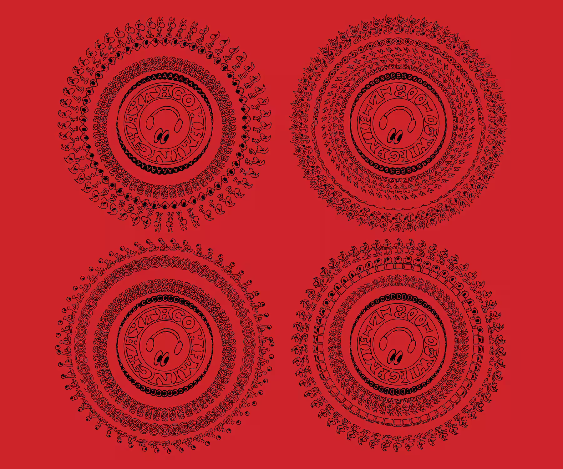 The limited-edition 2LP Picture Disc for Taco Hemingway’s 1-800-Oświecenie features hand-drawn lettering and illustrations that transform into phenakistiscopic animations across all four sides (once played). A phenakistiscope is an early animation device that creates the illusion of motion when spun at a consistent speed; here, the vinyl itself acts as the medium. When viewed through a camera or strobe light on a turntable, the artwork comes to life in a series of mesmerizing loops.