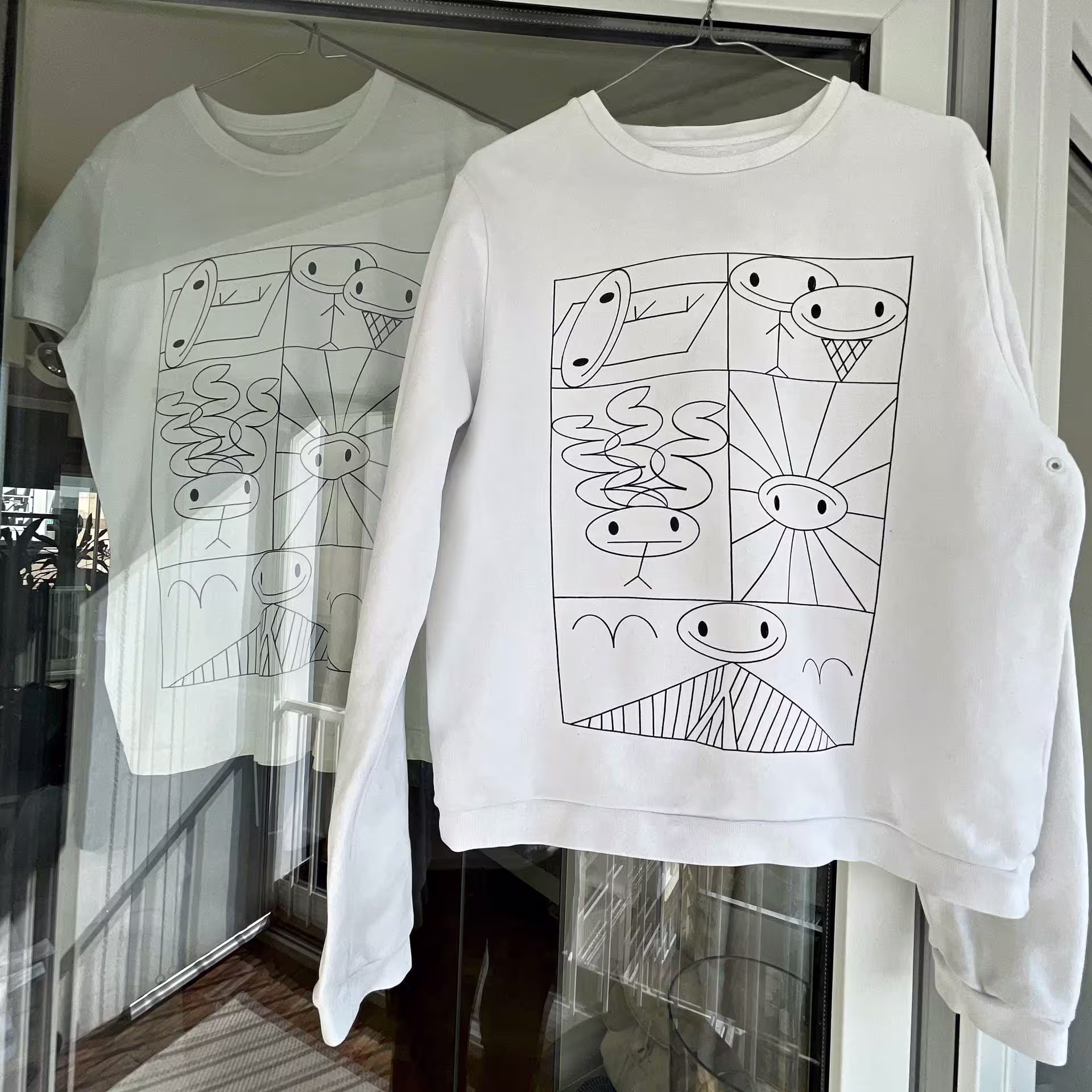 A drawing celebrating Vistula River Day is a playful take on the generative potentialities of the simple line. It gives the spectator a playful impression, making it the perfect reminder of summer in the city. This unique illustration was printed on white t-shirts and long sleeves using the silkscreen method.